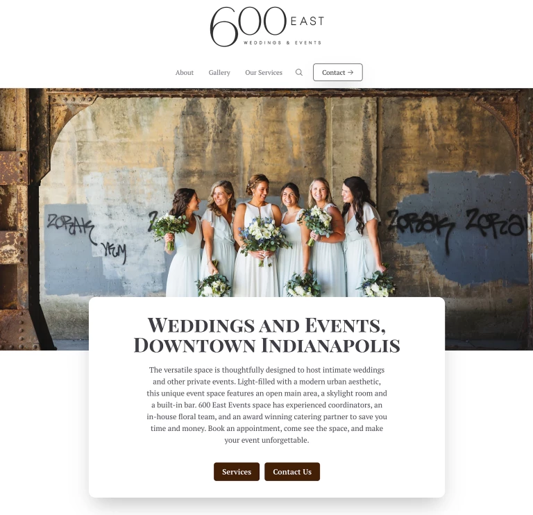 600 East Events, located in downtown Indianapolis, Indiana, is a modern, urban event space designed to host intimate weddings and private events. The website was crafted to highlight the venue’s versatile space, which includes a skylight room, a built-in bar, and customizable event packages. The design emphasizes elegance and functionality, ensuring users can easily explore the venue, learn about the services offered, and book appointments.
